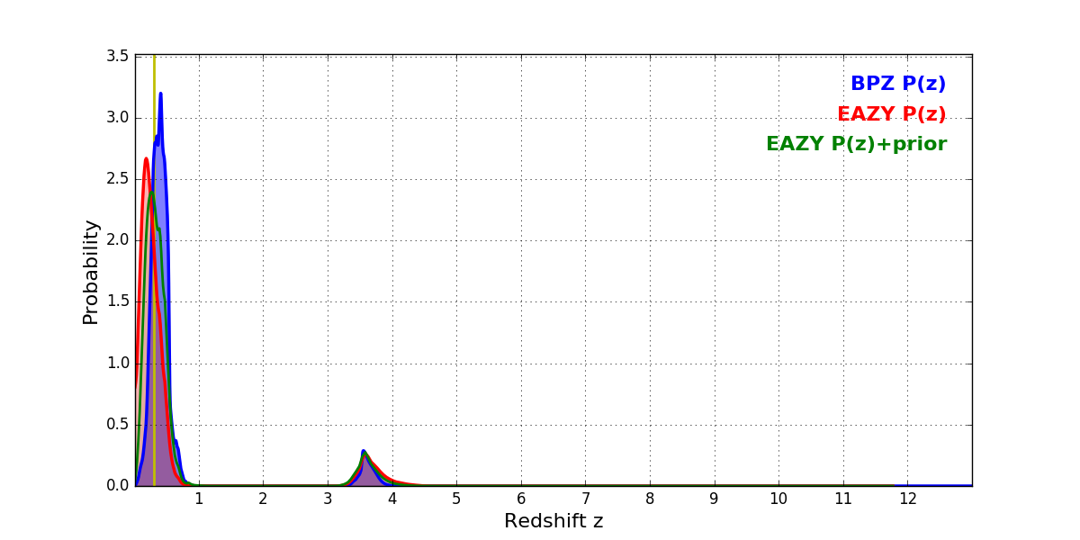 In P(z) plots: Yellow lines mark the cluster redshift z = 0.307,