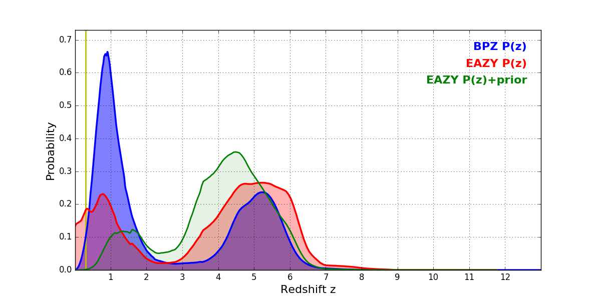 In P(z) plots: Yellow lines mark the cluster redshift z = 0.307,
