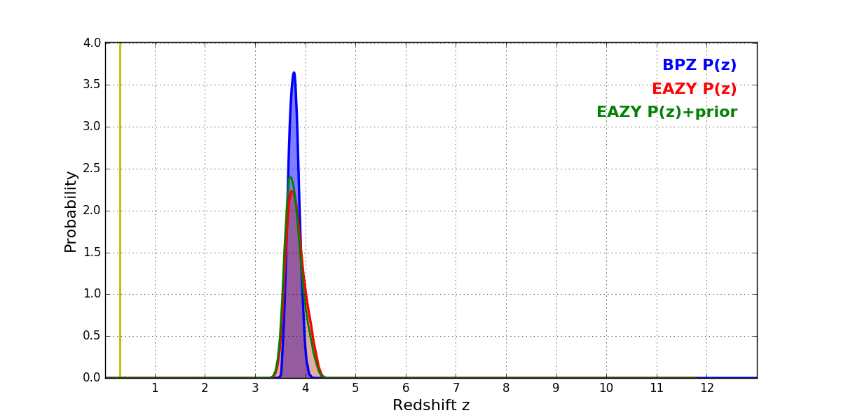 In P(z) plots: Yellow lines mark the cluster redshift z = 0.307,