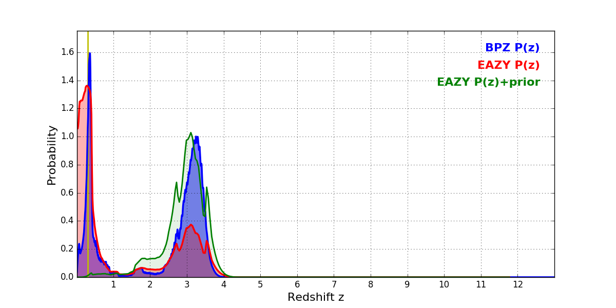In P(z) plots: Yellow lines mark the cluster redshift z = 0.307,