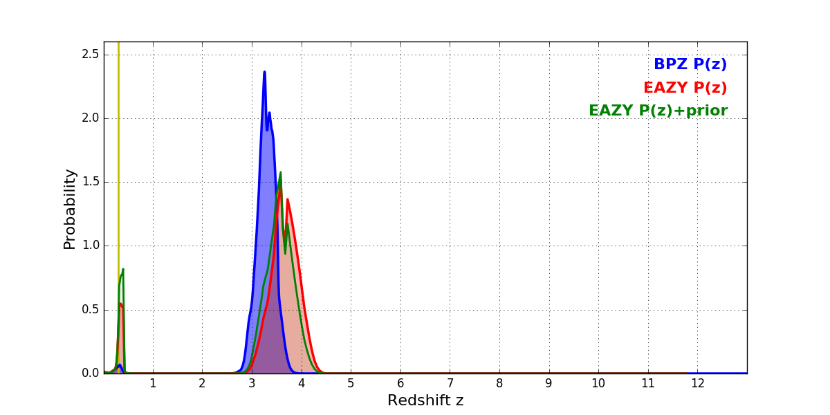 In P(z) plots: Yellow lines mark the cluster redshift z = 0.307,