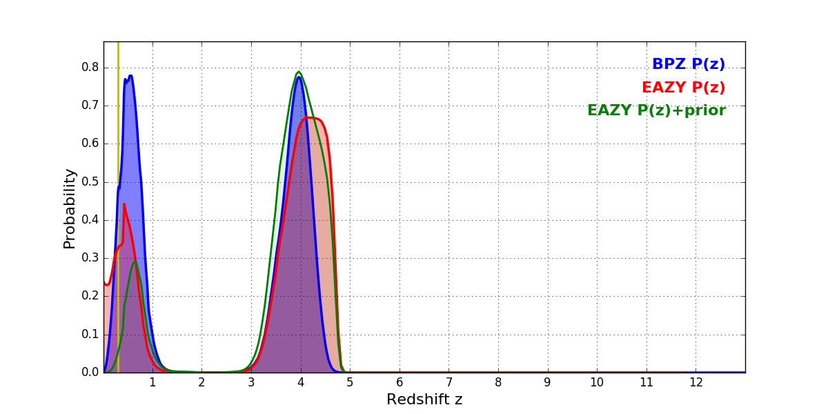 In P(z) plots: Yellow lines mark the cluster redshift z = 0.307,