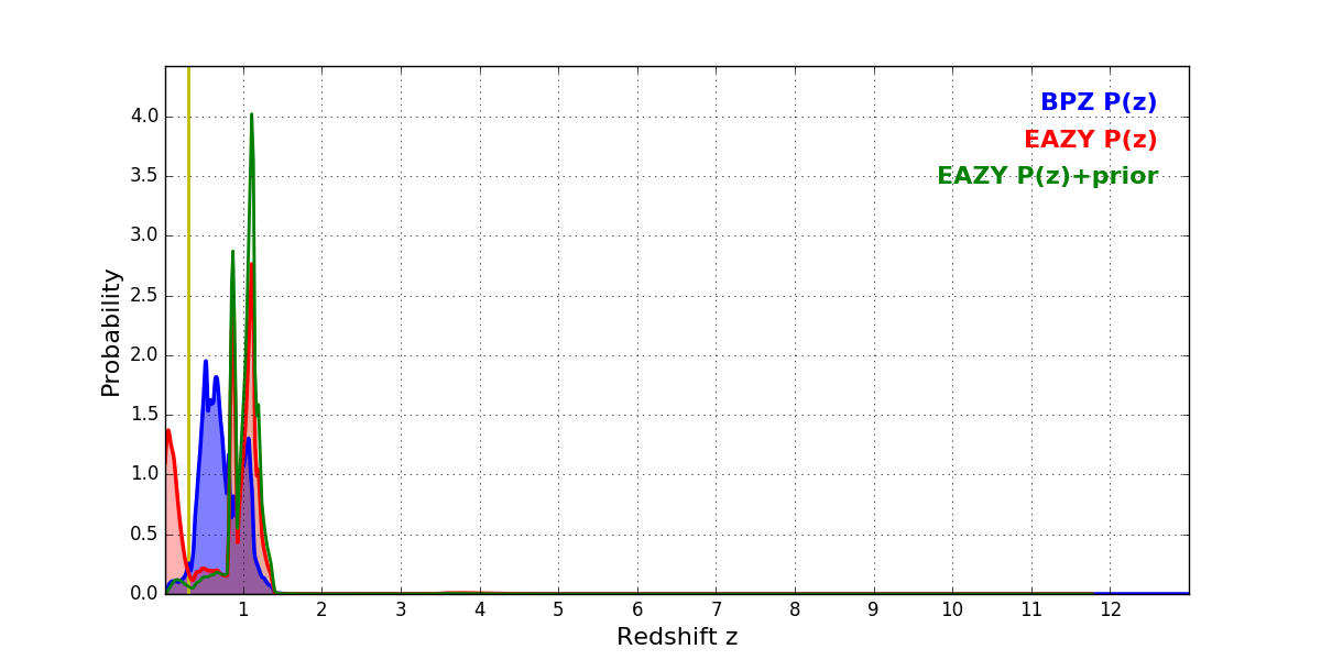 In P(z) plots: Yellow lines mark the cluster redshift z = 0.307,