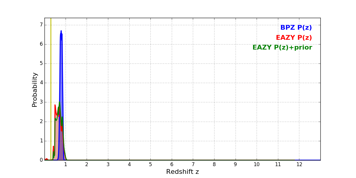 In P(z) plots: Yellow lines mark the cluster redshift z = 0.307,