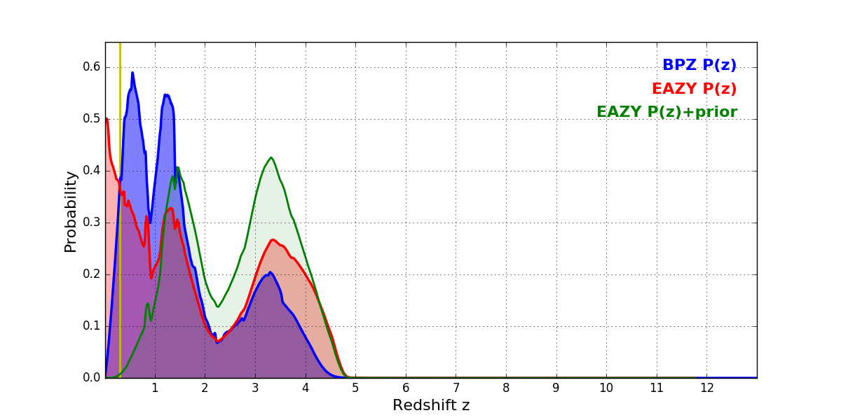 In P(z) plots: Yellow lines mark the cluster redshift z = 0.307,