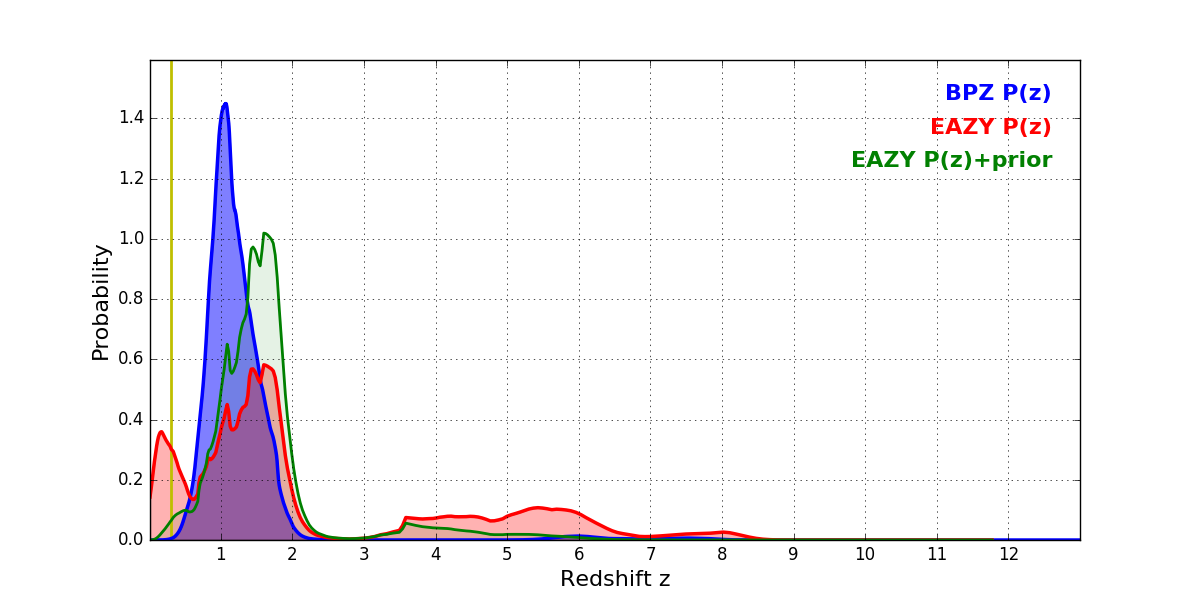 In P(z) plots: Yellow lines mark the cluster redshift z = 0.307,