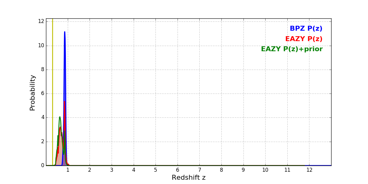 In P(z) plots: Yellow lines mark the cluster redshift z = 0.307,