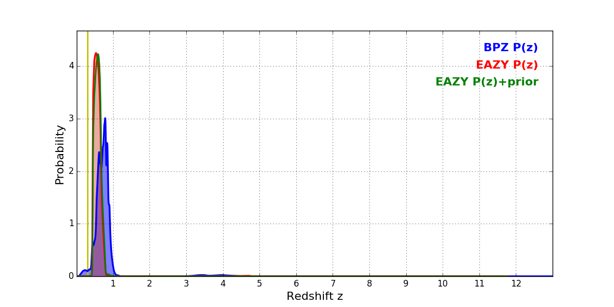 In P(z) plots: Yellow lines mark the cluster redshift z = 0.307,