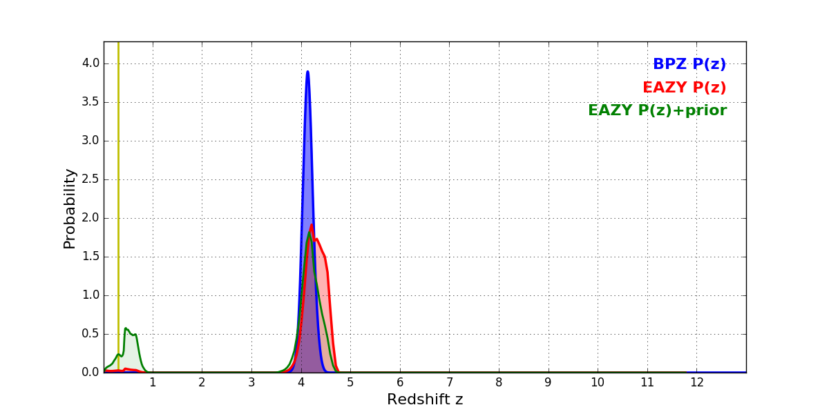 In P(z) plots: Yellow lines mark the cluster redshift z = 0.307,