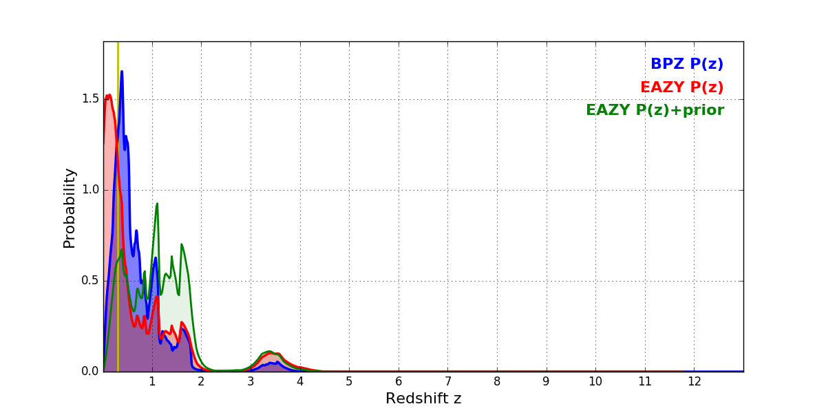 In P(z) plots: Yellow lines mark the cluster redshift z = 0.307,