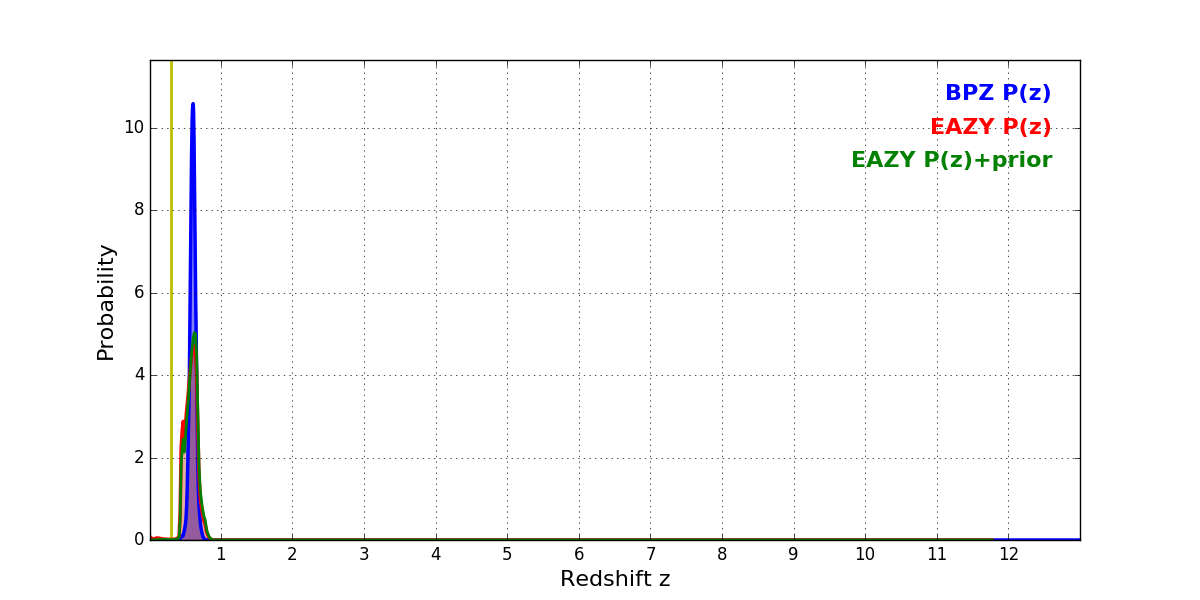 In P(z) plots: Yellow lines mark the cluster redshift z = 0.307,