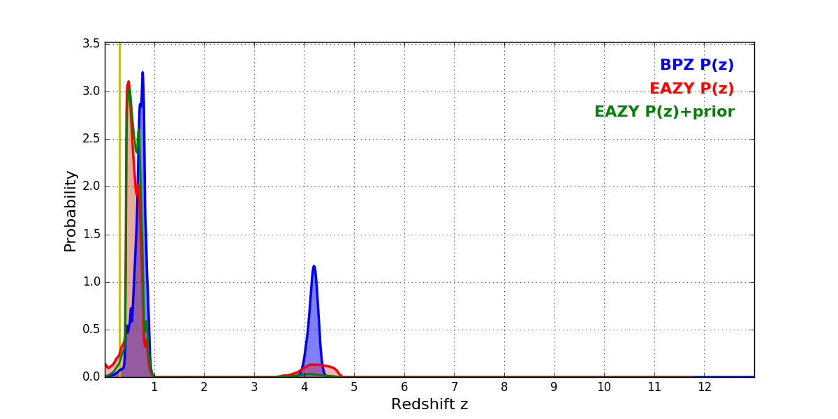 In P(z) plots: Yellow lines mark the cluster redshift z = 0.307,