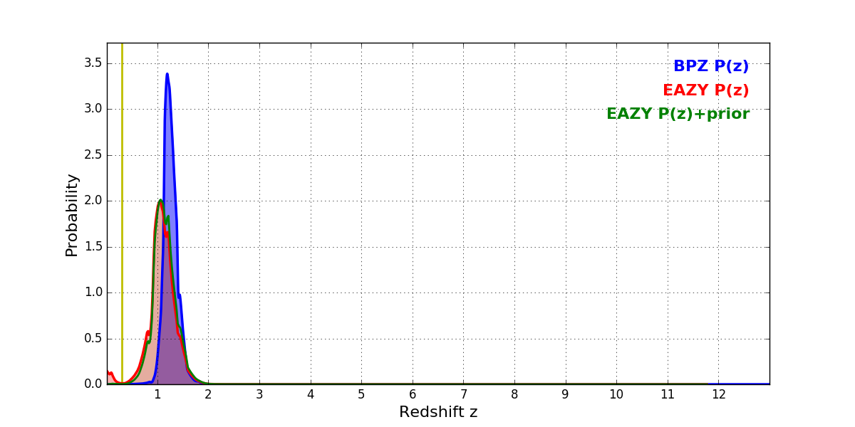 In P(z) plots: Yellow lines mark the cluster redshift z = 0.307,