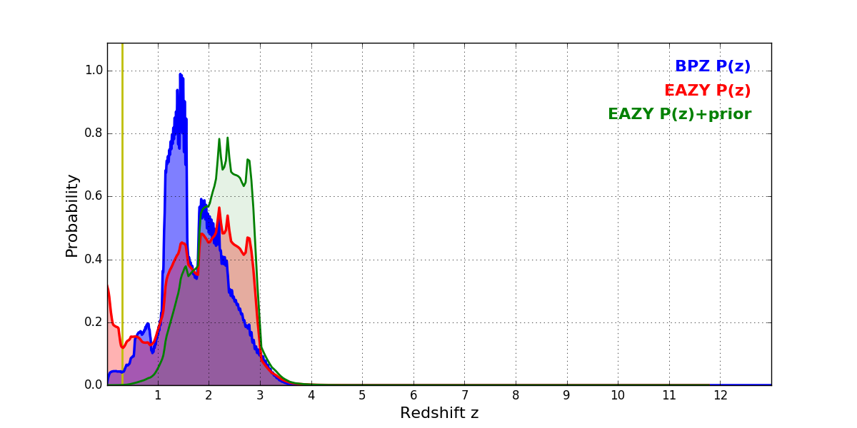 In P(z) plots: Yellow lines mark the cluster redshift z = 0.307,