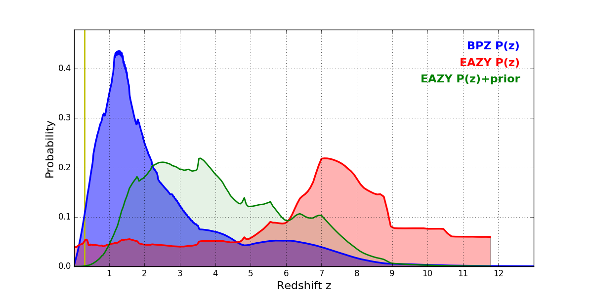 In P(z) plots: Yellow lines mark the cluster redshift z = 0.307,