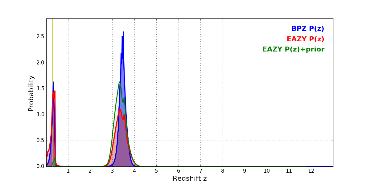 In P(z) plots: Yellow lines mark the cluster redshift z = 0.307,