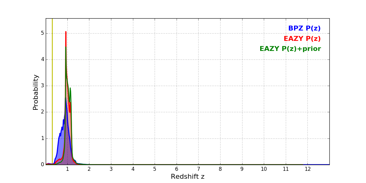 In P(z) plots: Yellow lines mark the cluster redshift z = 0.307,