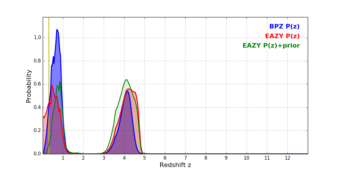 In P(z) plots: Yellow lines mark the cluster redshift z = 0.307,