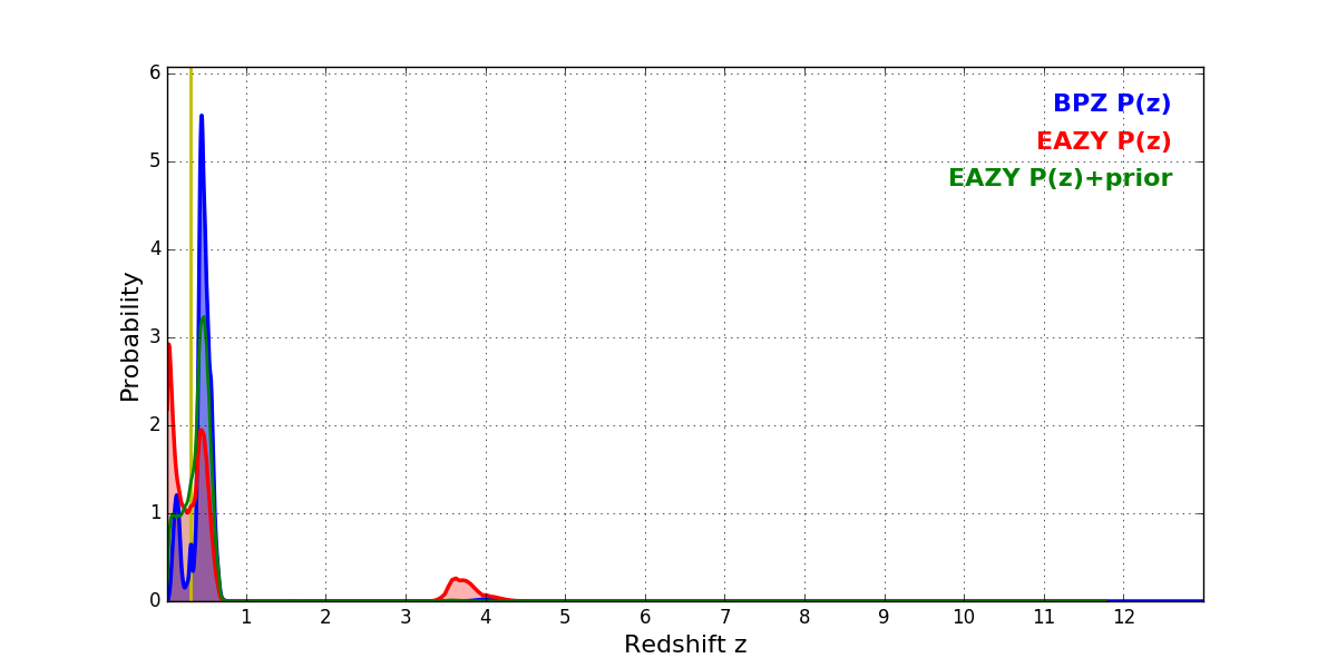 In P(z) plots: Yellow lines mark the cluster redshift z = 0.307,