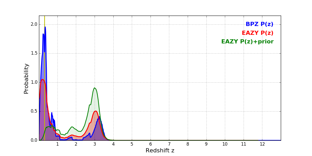In P(z) plots: Yellow lines mark the cluster redshift z = 0.307,