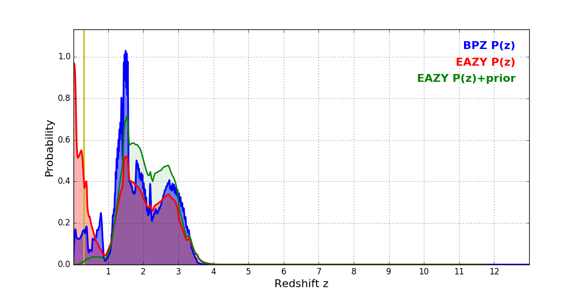 In P(z) plots: Yellow lines mark the cluster redshift z = 0.307,