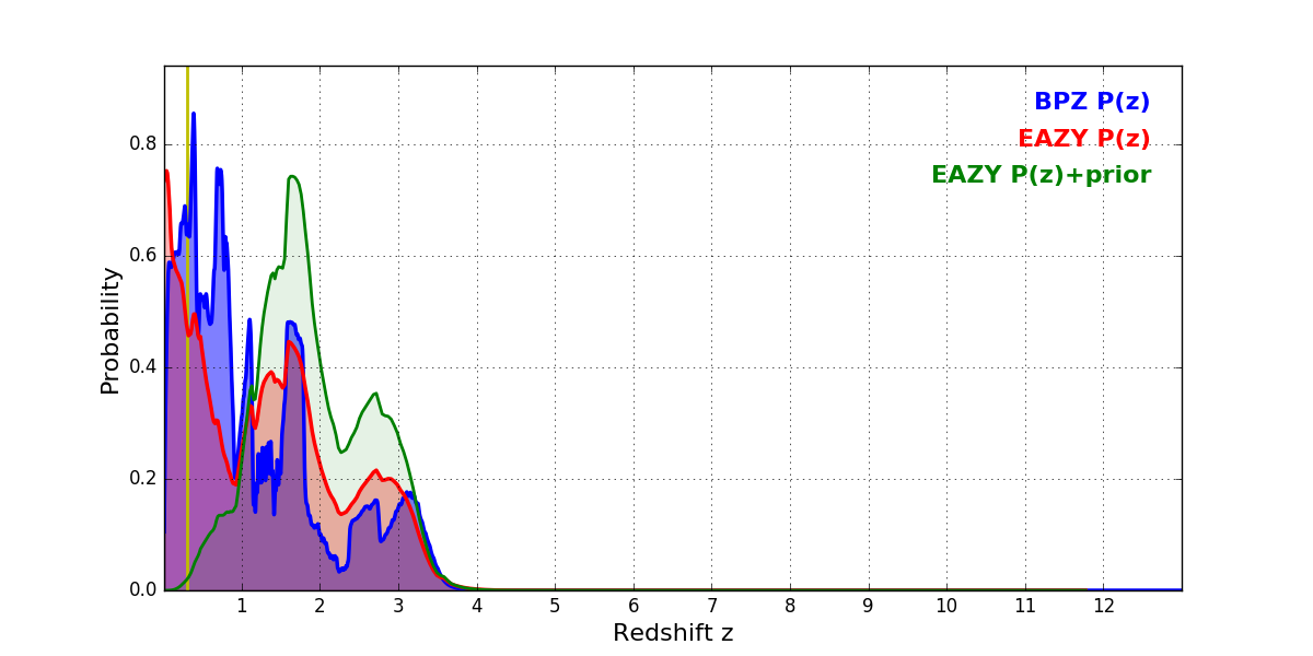 In P(z) plots: Yellow lines mark the cluster redshift z = 0.307,