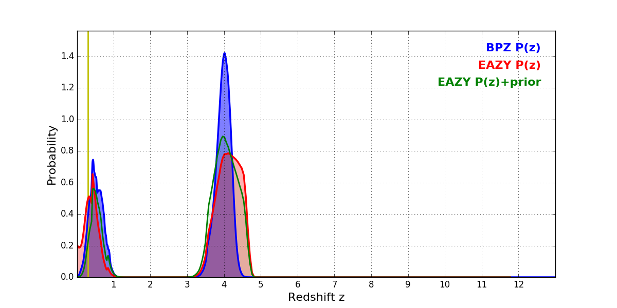 In P(z) plots: Yellow lines mark the cluster redshift z = 0.307,