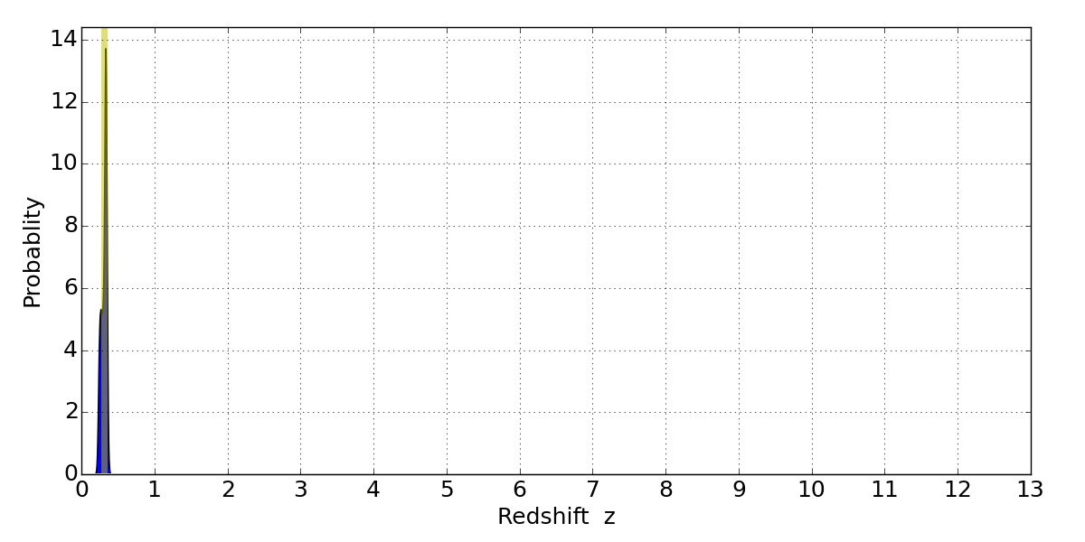 In P(z) plots: Yellow lines mark the cluster redshift z = 0.307,