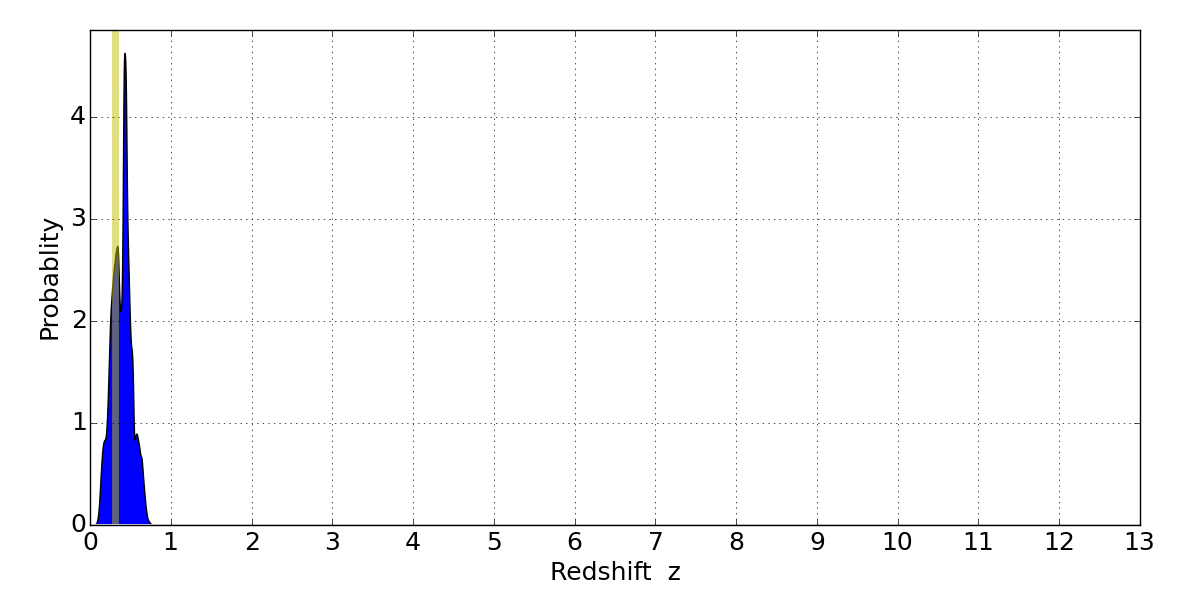 In P(z) plots: Yellow lines mark the cluster redshift z = 0.307,