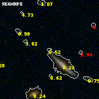 Object #100 x,y = (5600, 5478) RA, Dec = (13:32:34.920, 50:34:31.80) = (203.14550, 50.57550) BPZ = 0.516 [0.127--3.957] type = 9.10 (SB2_B10 - SB3_B10) chisq2 = 0.56 ODDS = 0.19 z_cluster = 0.280