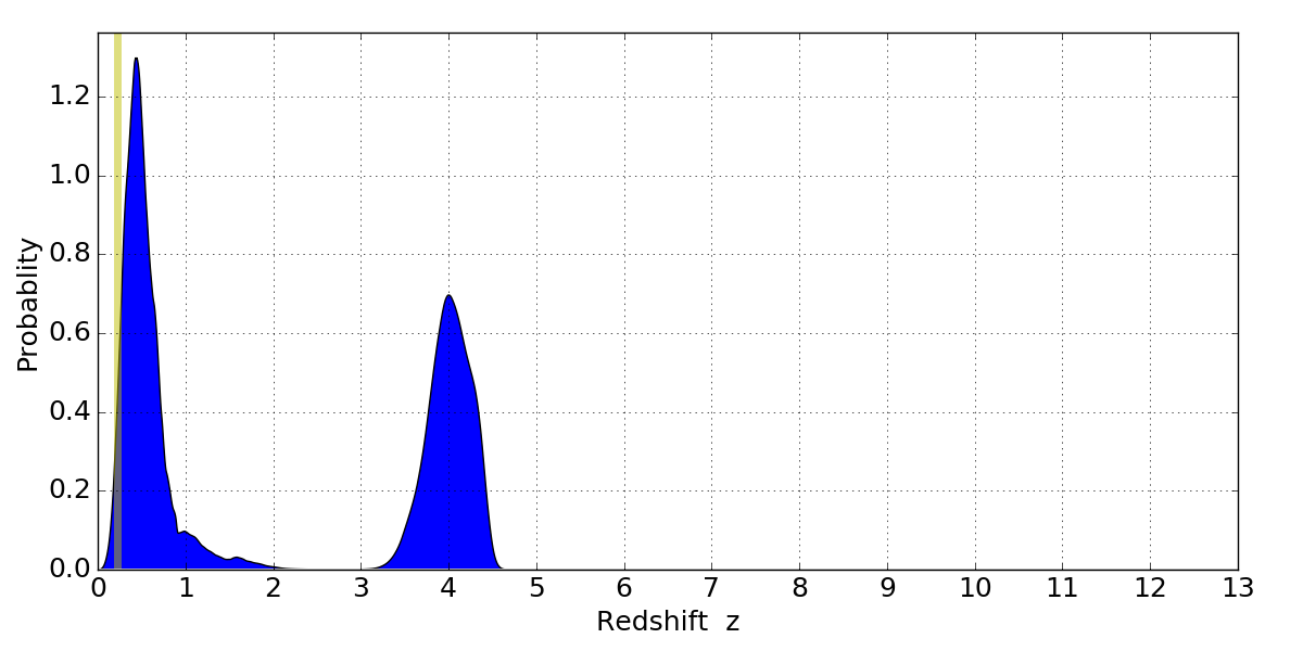 In P(z) plots: Yellow lines mark the cluster redshift z = 0.228,