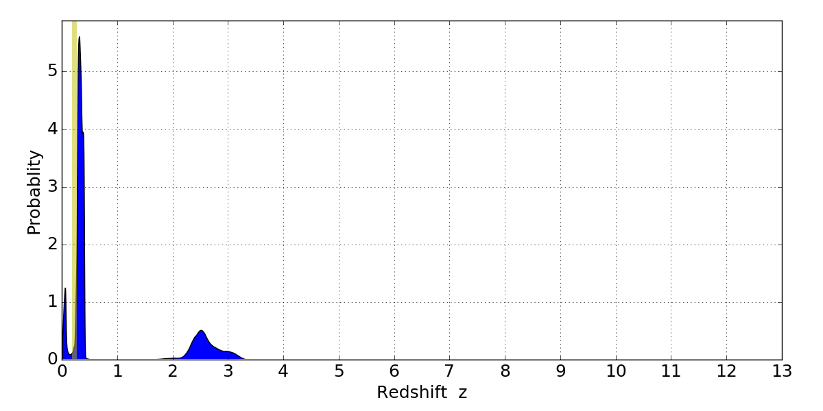 In P(z) plots: Yellow lines mark the cluster redshift z = 0.228,