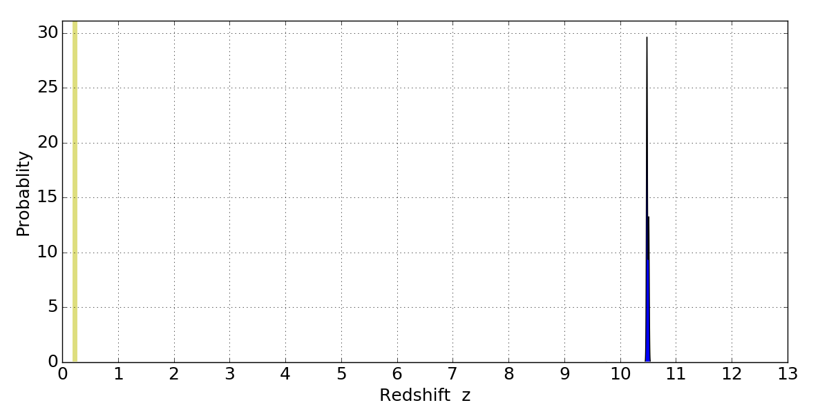 In P(z) plots: Yellow lines mark the cluster redshift z = 0.228,