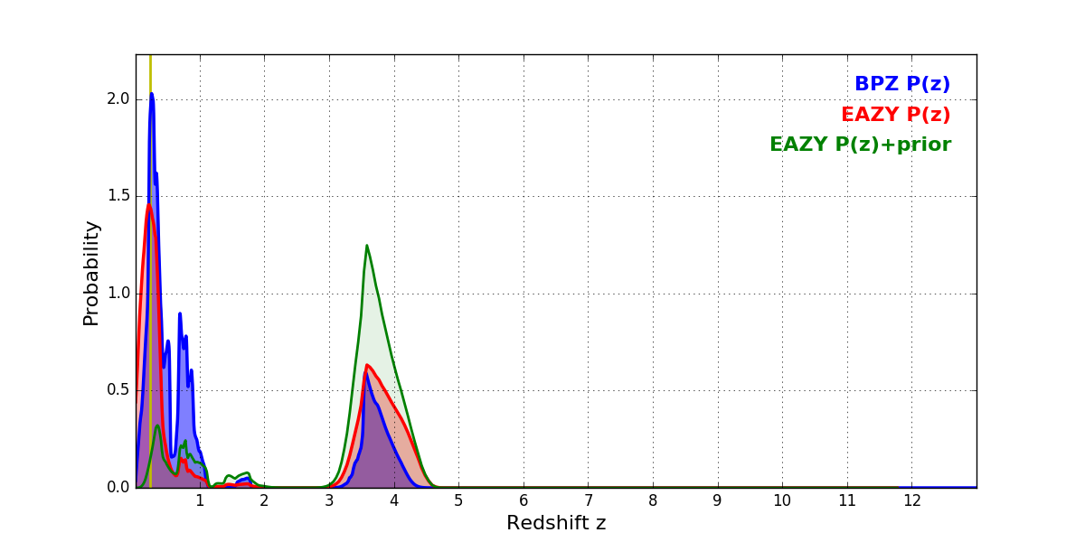 In P(z) plots: Yellow lines mark the cluster redshift z = 0.228,