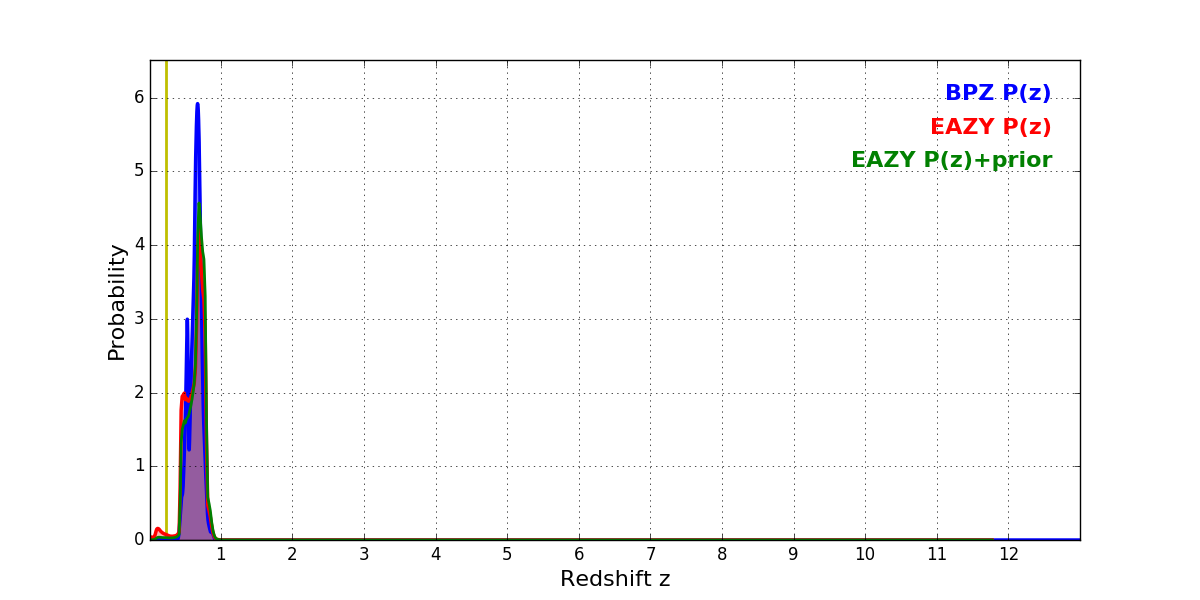 In P(z) plots: Yellow lines mark the cluster redshift z = 0.228,