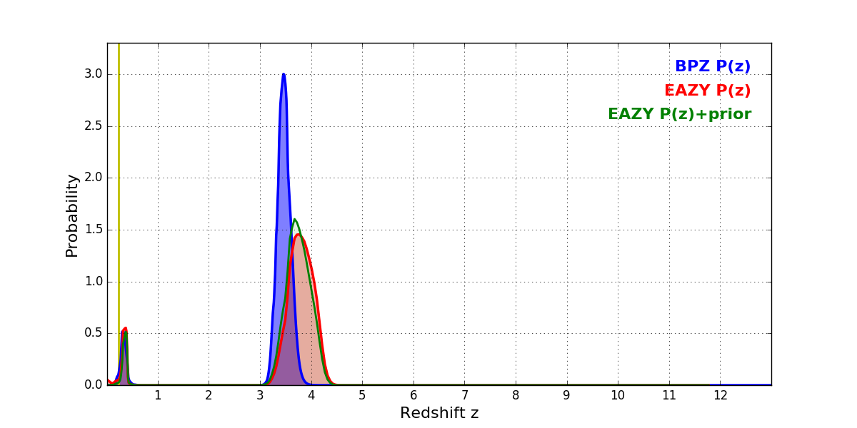 In P(z) plots: Yellow lines mark the cluster redshift z = 0.228,