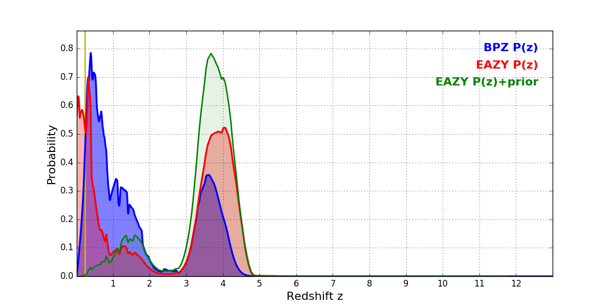 In P(z) plots: Yellow lines mark the cluster redshift z = 0.228,