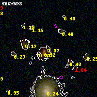 Object #767   x,y = (5450, 1298)   RA, Dec = (16:15:37.560, -6:11:06.72) = (243.90650, -6.18520)   BPZ = 1.369 [0.133--2.994]   type = 8.60 (SB2_B10 - SB1_B10)   chisq2 = 0.00   ODDS = 0.09   z_cluster = 0.203