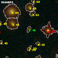 Object #1071 x,y = (3685, 3715) RA, Dec = (16:15:44.664, -6:08:42.00) = (243.93610, -6.14500) BPZ = 3.458 [3.337--3.555] type = 9.00 (SB2_B10) chisq2 = 0.10 ODDS = 1.00 z_cluster = 0.203