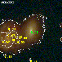 Object #349 x,y = (3741, 4927) RA, Dec = (16:15:44.448, -6:07:29.28) = (243.93520, -6.12480) BPZ = 0.079 [0.049--0.105] type = 4.10 (Ell4_A_0 - ES0_B10) chisq2 = 0.17 ODDS = 1.00 z_cluster = 0.203