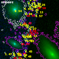 Object #1924 x,y = (4461, 2969) RA, Dec = (23:08:13.776, -2:11:00.24) = (347.05740, -2.18340) BPZ = 9.578 [5.789--10.512] type = 6.40 (Sbc_B10 - Scd_B10) chisq2 = 900.00 ODDS = 0.23 z_cluster = 0.297