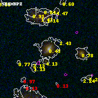 Object #3765 x,y = (2357, 1773) RA, Dec = (23:08:22.200, -2:12:12.24) = (347.09250, -2.20340) BPZ = 0.427 [0.063--0.511] type = 7.50 (SB1_B10 - Scd_B10) chisq2 = 0.09 ODDS = 0.79 z_cluster = 0.297