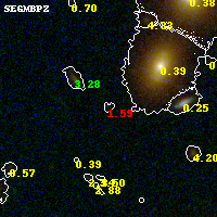 Object #144 x,y = (2892, 3217) RA, Dec = (23:08:20.064, -2:10:45.48) = (347.08360, -2.17930) BPZ = 1.591 [0.180--3.753] type = 8.20 (SB1_B10 - SB2_B10) chisq2 = 1.47 ODDS = 0.16 z_cluster = 0.297