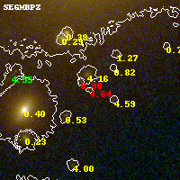Object #589 x,y = (2351, 2290) RA, Dec = (23:08:22.224, -2:11:41.28) = (347.09260, -2.19480) BPZ = 4.639 [4.277--4.909] type = 11.00 (SB11_A_0_l) chisq2 = 1.57 ODDS = 0.89 z_cluster = 0.297