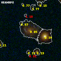 Object #846 x,y = (2320, 1661) RA, Dec = (23:08:22.344, -2:12:18.72) = (347.09310, -2.20520) BPZ = 0.851 [0.778--0.933] type = 7.90 (SB1_B10 - Scd_B10) chisq2 = 0.19 ODDS = 0.94 z_cluster = 0.297