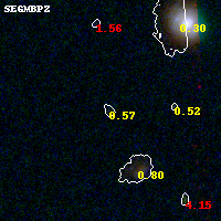 Object #874 x,y = (3360, 1633) RA, Dec = (23:08:18.192, -2:12:20.52) = (347.07580, -2.20570) BPZ = 0.575 [0.122--3.577] type = 9.30 (SB2_B10 - SB3_B10) chisq2 = 0.27 ODDS = 0.24 z_cluster = 0.297