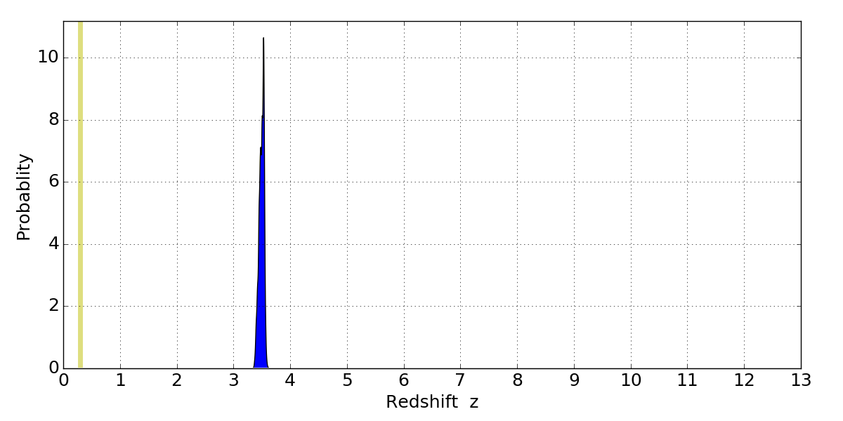In P(z) plots: Yellow lines mark the cluster redshift z = 0.297,