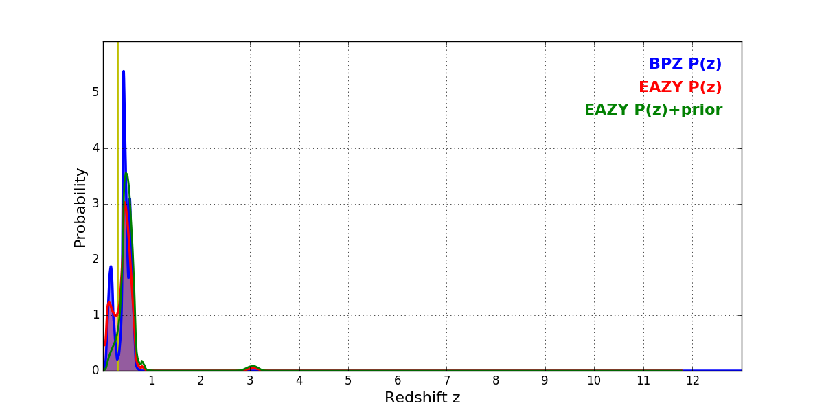 In P(z) plots: Yellow lines mark the cluster redshift z = 0.297,