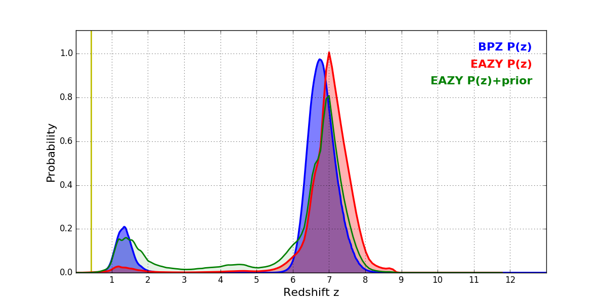 In P(z) plots: Yellow lines mark the cluster redshift z = 0.425,