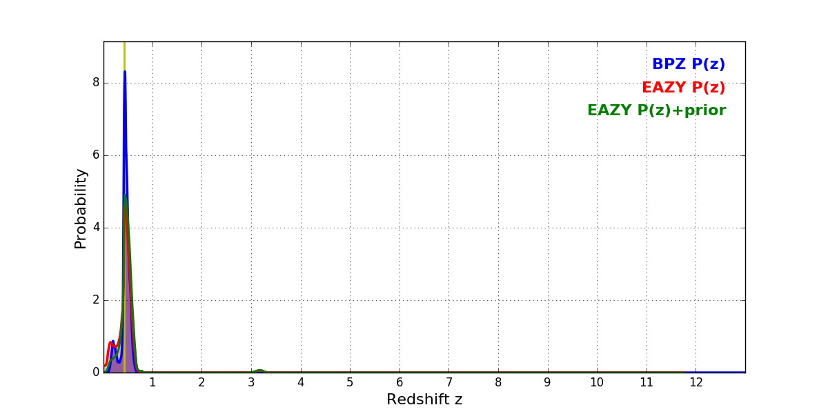 In P(z) plots: Yellow lines mark the cluster redshift z = 0.425,